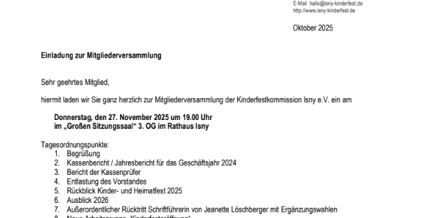 Weitere Anträge zur Tagesordnung können bis Donnerstag, 13. November 2025, bei der Geschäftsstelle der Kinderfestkommission Isny e.V. eingereicht werden.